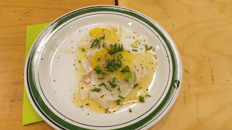 Klargør torskefileten, skær den i tynde skiver, og vend den i marinaden. Lad den trække et par minutter, til den begynder at blive mælkehvid.